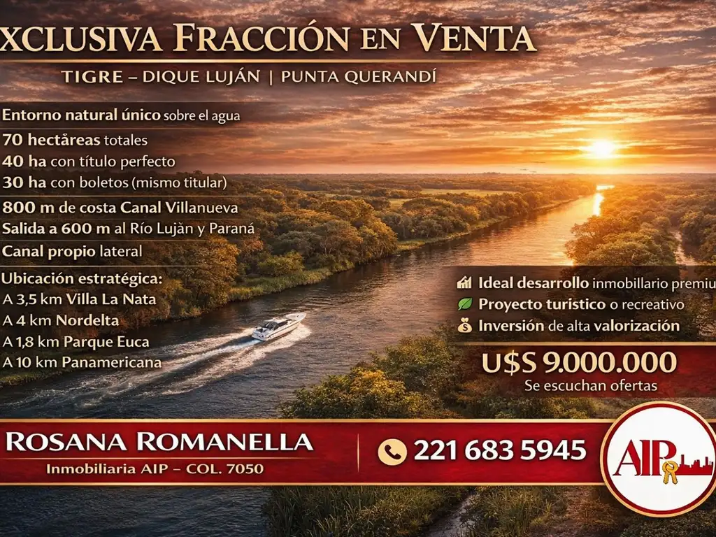Fracción en venta en Tigre Dique Luján (Punta Querandí)Excelente oportunidad de inversión en una de las zonas con mayor crecimiento del corredor norte, a minutos de Nordelta y con rápidos accesos a Panamericana.