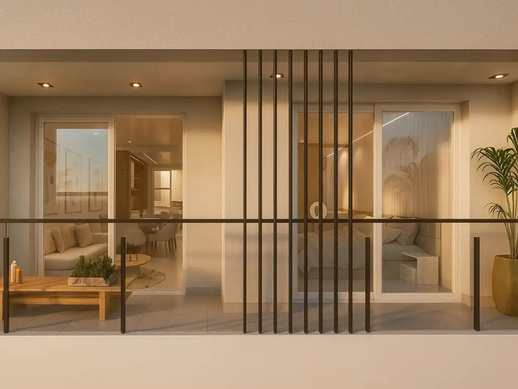 Balcones con barandas de vidrio laminado y parasoles negros en WPC