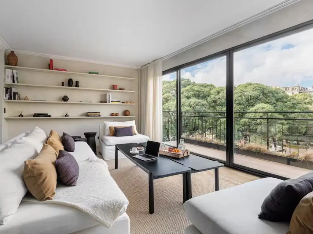 Continuamos y nos encontramos con un amplio y luminoso living, diseñado para el máximo confort. Grandes ventanales enmarcan impresionantes vistas panorámicas a la Plaza Vicente López, permitiendo que la luz natural inunde el ambiente. Desde aquí, accedemos al balcón terraza, un espacio ideal para disfrutar del aire libre en pleno Recoleta.
