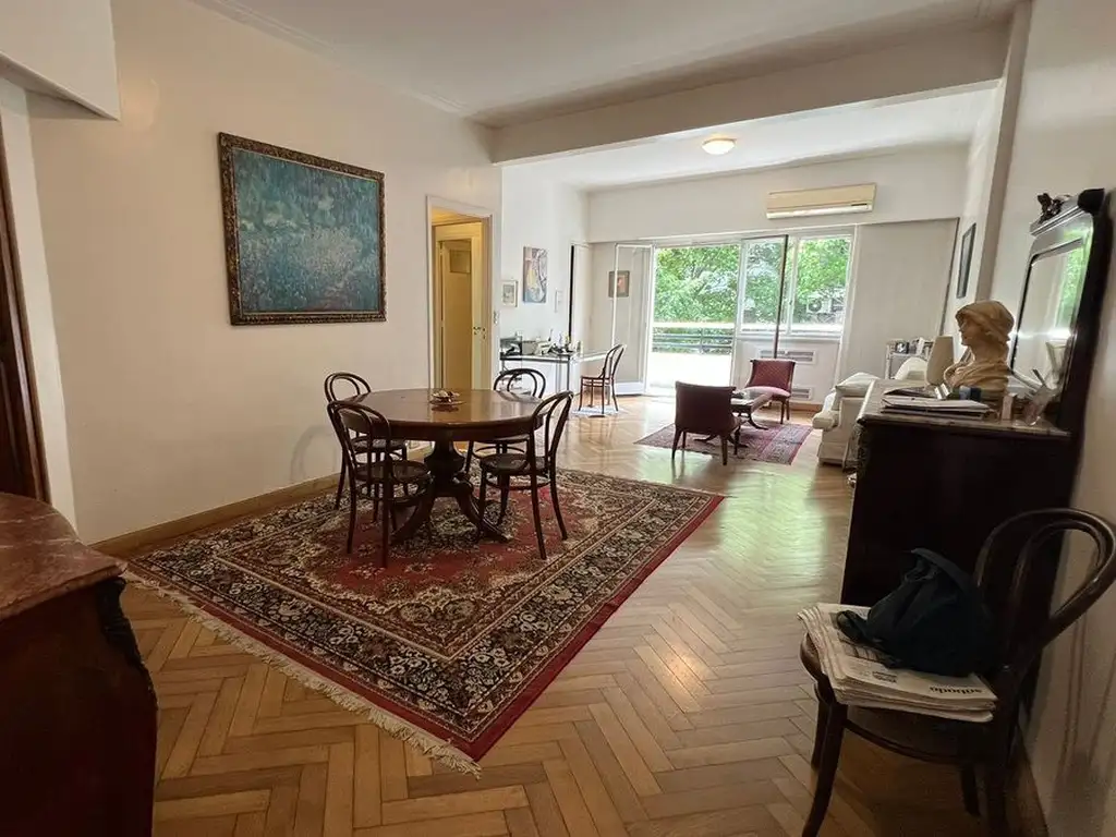 El living comedor es generoso en dimensiones, con salida a balcón corrido al frente y una vista abierta a las copas de los árboles, que aporta verde y privacidad.