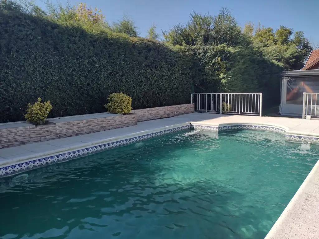 Pileta con gran solárium,riego por aspersión, jardín parquizado.