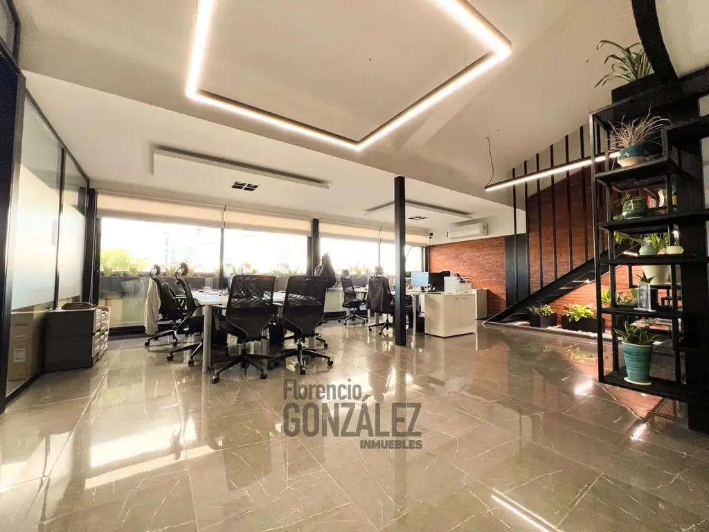Al ingresar, te recibirá un imponente hall de entrada con piso de porcelanato y doble altura, que conduce a tres espacios de trabajo luminosos y versátiles. Uno de ellos se encuentra en un entrepiso con cerramientos de vidrio, ofreciendo una perspectiva única y conectividad visual. Los otros dos espacios son amplios, inundados de luz natural gracias a los grandes ventanales.