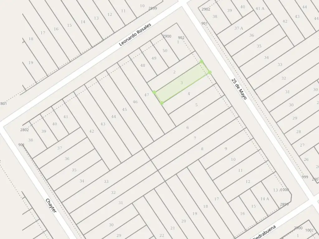 Terreno de 8.66 de frente por 40 de fondo, dando a la calle 25 de mayo, por la cual pasan varias líneas de colectivos, se encuentra a dos cuadras de la calle bynnon, zona comercial, plaza, iglesia, y colegios.