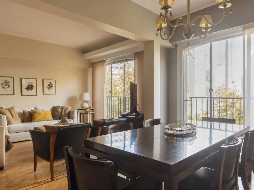 Hall. Living y un ex tercer dormitorio hoy integrado como comedor. Cuarto principal también al frente con salida a balcón. Segundo dormitorio al aire luz. Dos baños. Cocina. Cuarto y baño de servicio con salida a un mini balcón.