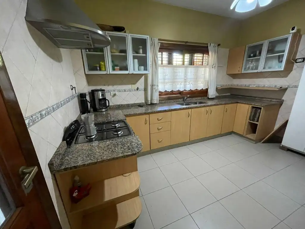 La cocina se destaca por su excelente estado de conservación, equipada con electrodomésticos de poco uso y spar. Las aberturas son de alta calidad, con vidrios repartidos y postigos que añaden valor estético y funcional.