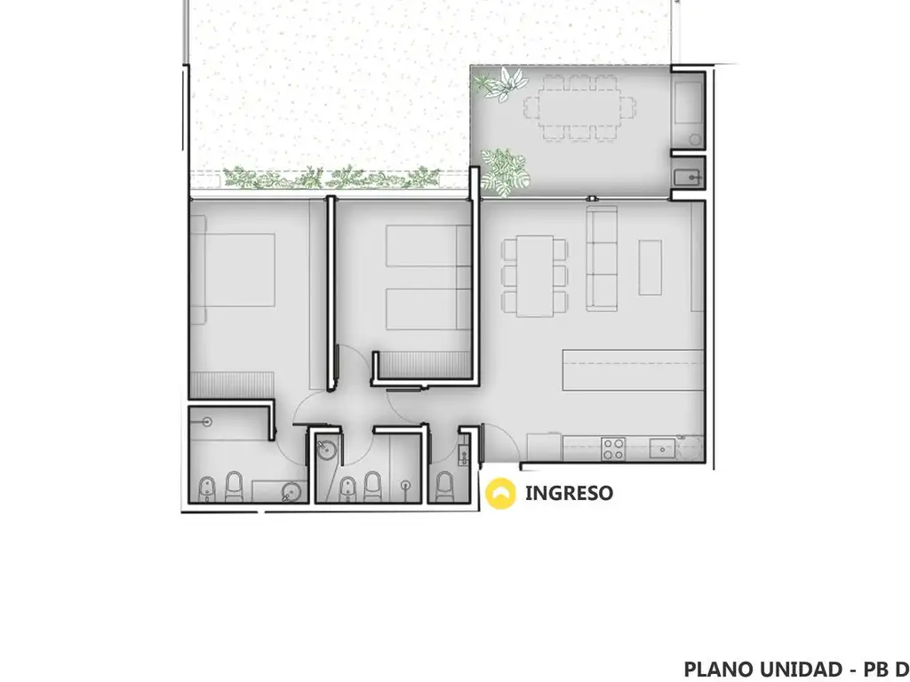 La unidad se desarrolla en una planta con dos dormitorios y una distribución funcional que vincula el área social con el exterior a través de una galería semicubierta y jardín propio. El sector de estar comedor se integra con la cocina, generando un espacio continuo con expansión directa al patio.