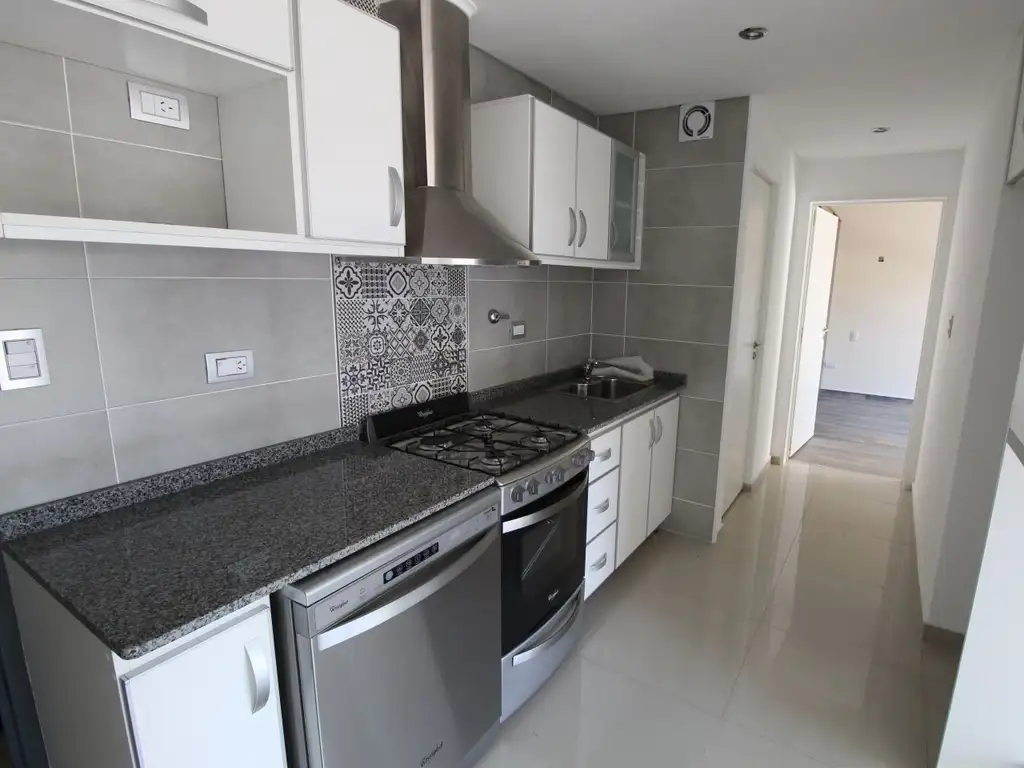 Cocina y lavavajillas Whirlpool , campana, mesada de granito, modulares con terminaciones e aluminio y vidrio, grifería FV monocomando. Los techos poseen yeseria y detalles de terminacion