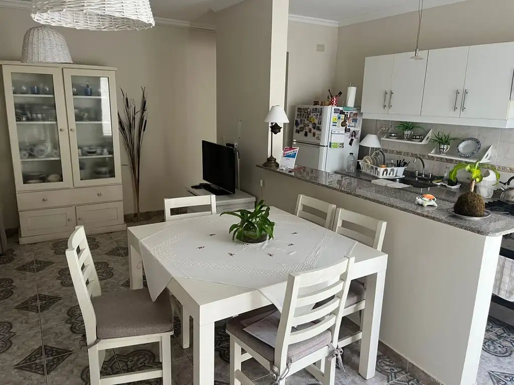 - Living comedor integrado a la cocina, separado por una moderna barra desayunadora.
