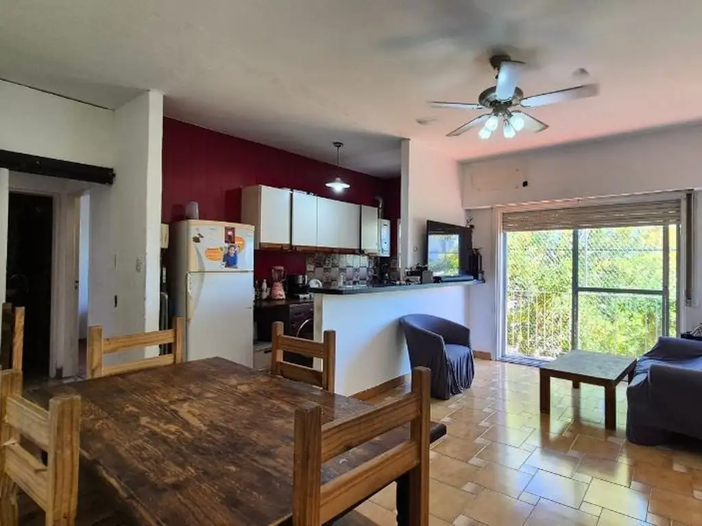 Cocina integrada al ambiente equipada con mobiliario en alto y bajo mesada, piso de cerámica, mesada desayunadora, extractor de humos.