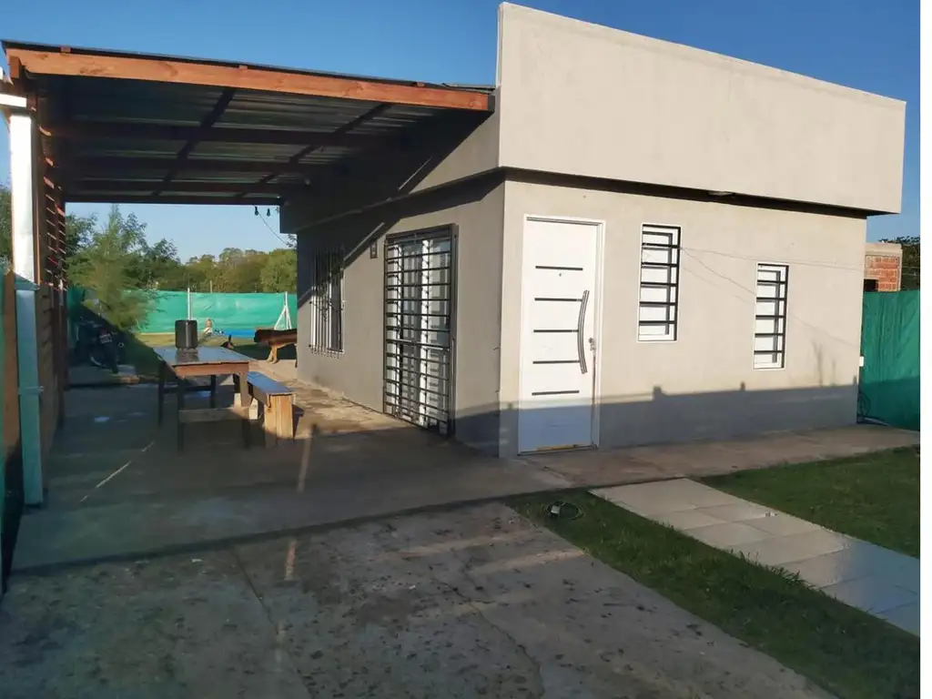 Sobre dicha platea se ha levantado la estructura de la casa en madera, y forrada en su exterior e interior, con placas cementicias con recubrimiento plástico y durlock, respectivamente. Platea con posibilidad de ampliar para otro dormitorio. Techos de chapa y cielorrasos en machimbre. Pisos y revestimientos en porcelanato.