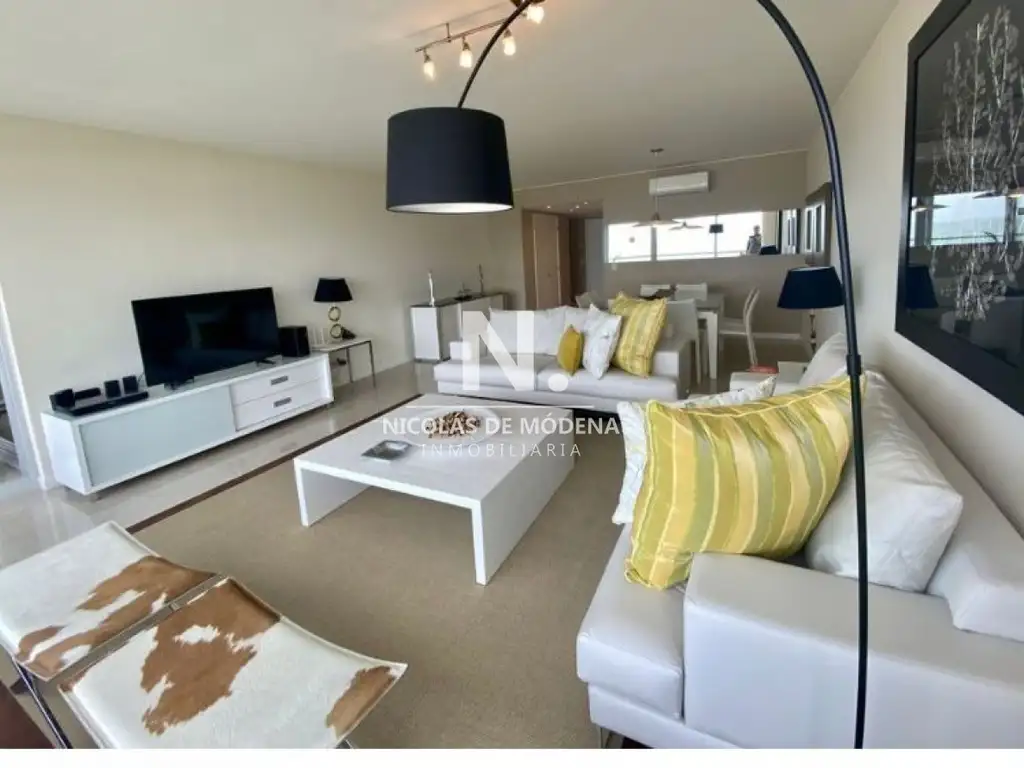 Al ingresar, recibe un techo con acabados refinados que dan paso a un amplio living comedor diseñado para la relajación y el entretenimiento. La elección cuidadosa de los materiales, como pisos de mármol y detalles en madera noble, refleja la alta calidad de los acabados en todo el espacio. Desde este ambiente, se accede a un elegante balcón terraza que se extiende a lo largo de la fachada del apartamento, permitiendo una vista panorámica inigualable del mar y el horizonte costero.