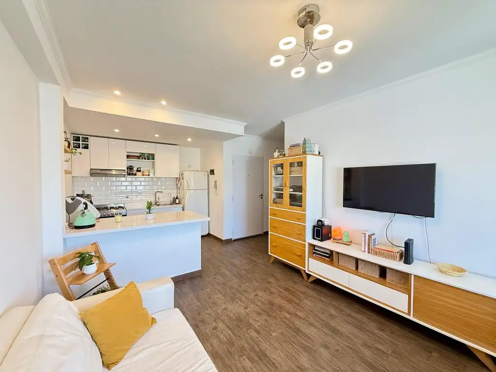 Living con salida al balcón, integrado a una cocina moderna con isla, ideal para sumar espacio de guardado y apoyo.