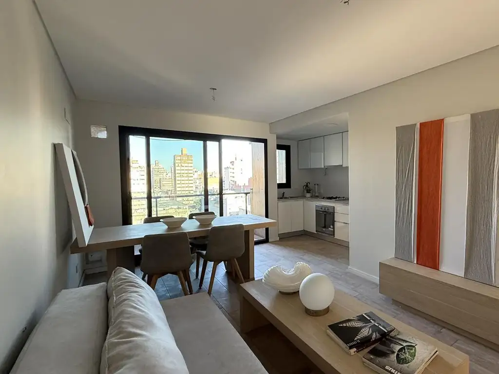 Ingreso a través de un hall recibidor. Se desarrolla un amplio estar-comedor, con proporciones cómodas que permiten una disposición flexible del mobiliario y una integración fluida con el balcón, generando una expansión natural y aportando luminosidad y ventilación.