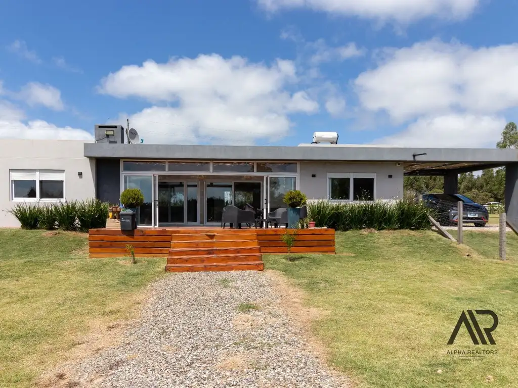 La casa principal, construida en Steel Framing, 125 m² distribuidos en 3 dormitorios uno en suite con vestidor, un amplio living comedor, cocina y 2 baños. Barbacoa techada y 1 deck abierto.