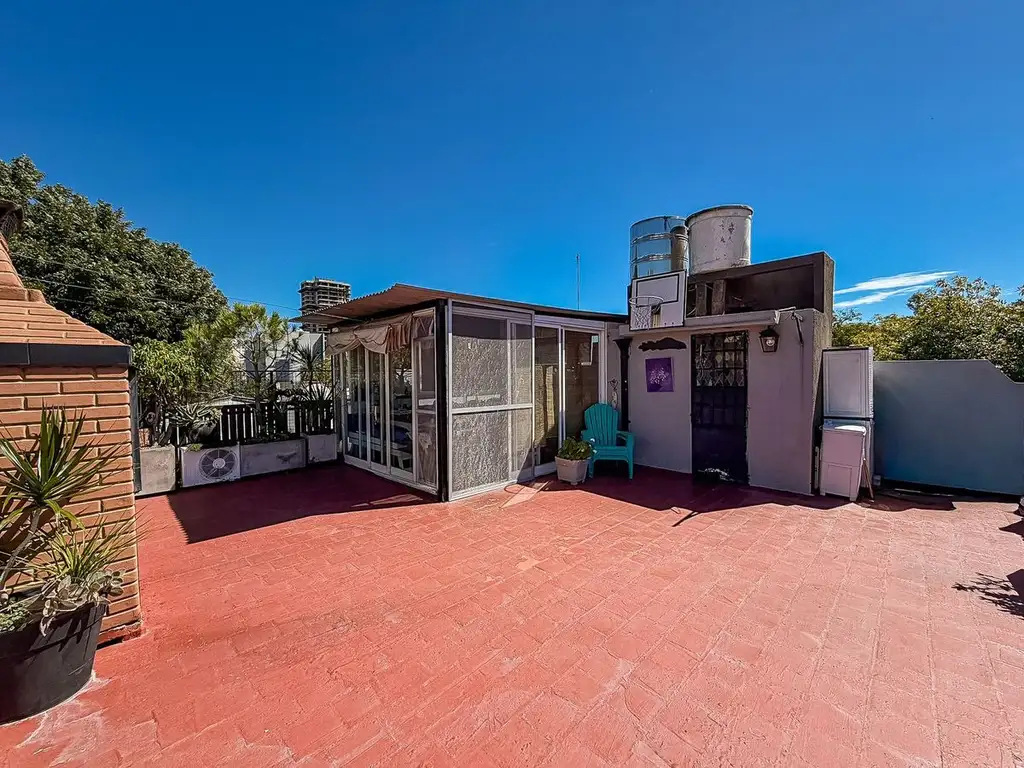 En la planta superior se destaca una amplia terraza propia, ideal para disfrutar al aire libre, con parrilla, lavadero y sol durante todo el día. Además, cuenta con un cerramiento metálico de 5x4 metros (es desmontable), que puede utilizarse como quincho. La terraza tiene posibilidad de construcción.