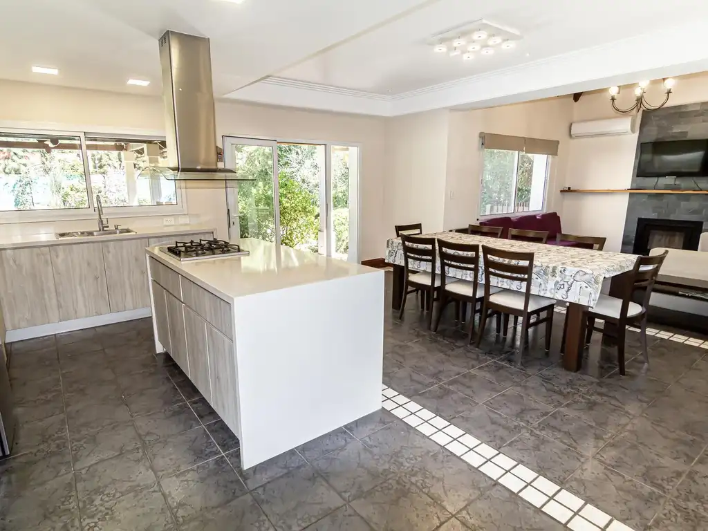 Ingreso a cocina integrada con amplia mesada de silestone, vinculada a un luminoso living-comedor con hogar, generando un ambiente cálido y acogedor.