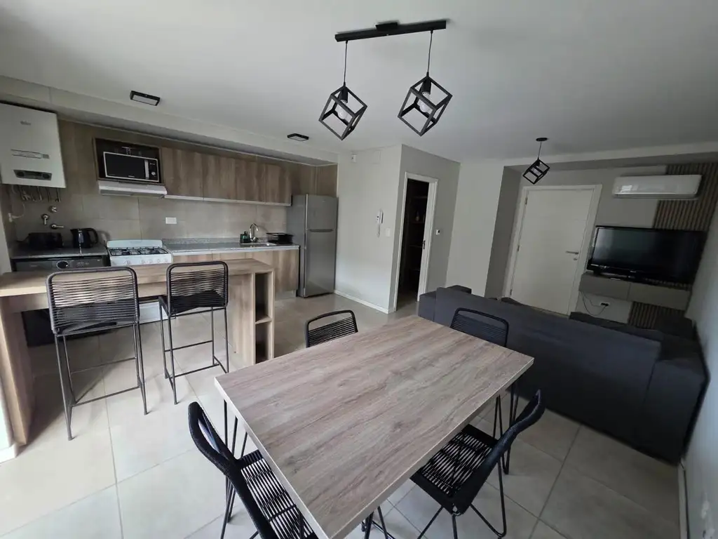 Living comedor integrado, cocina separada por barra desayunadora, totalmente equipada, amplio balcón, pasillos con placar de piso a techo, baño completo con mampara de vidrio. Dormitorio amplio.