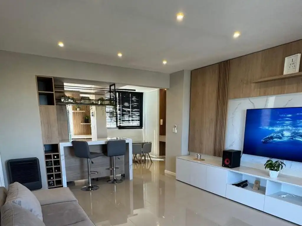 Cocina equipada con barra (porcelanato carrara, horno y anafe)