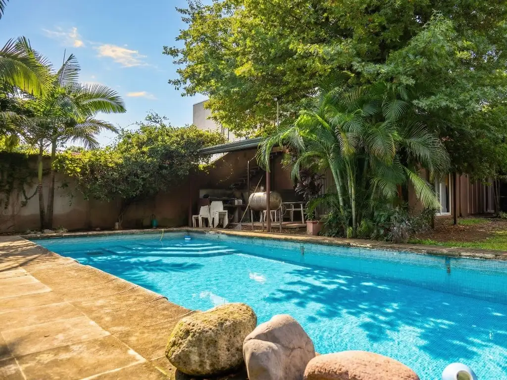 • Hermosa pileta, rodeada de verde, palmeras y árboles