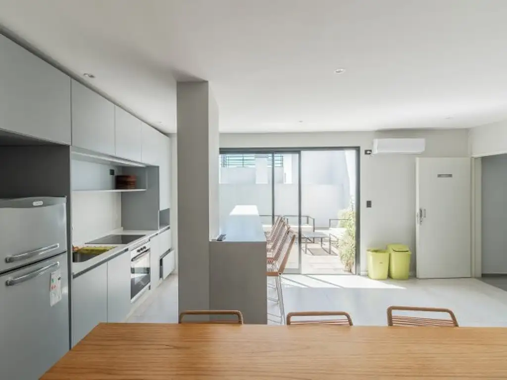 Excelente departamento de 2 ambientes de 41,9 m² totales, con diseño moderno y excelente luminosidad. Living comedor con salida a balcón, cocina integrada, dormitorio con balcón privado y baño completo con bañera y ducha y luz natural . Cocción a gas. 2 Aire acondicionado frio calor, Estufa. Amplio placard. Conexión a lavaropas.