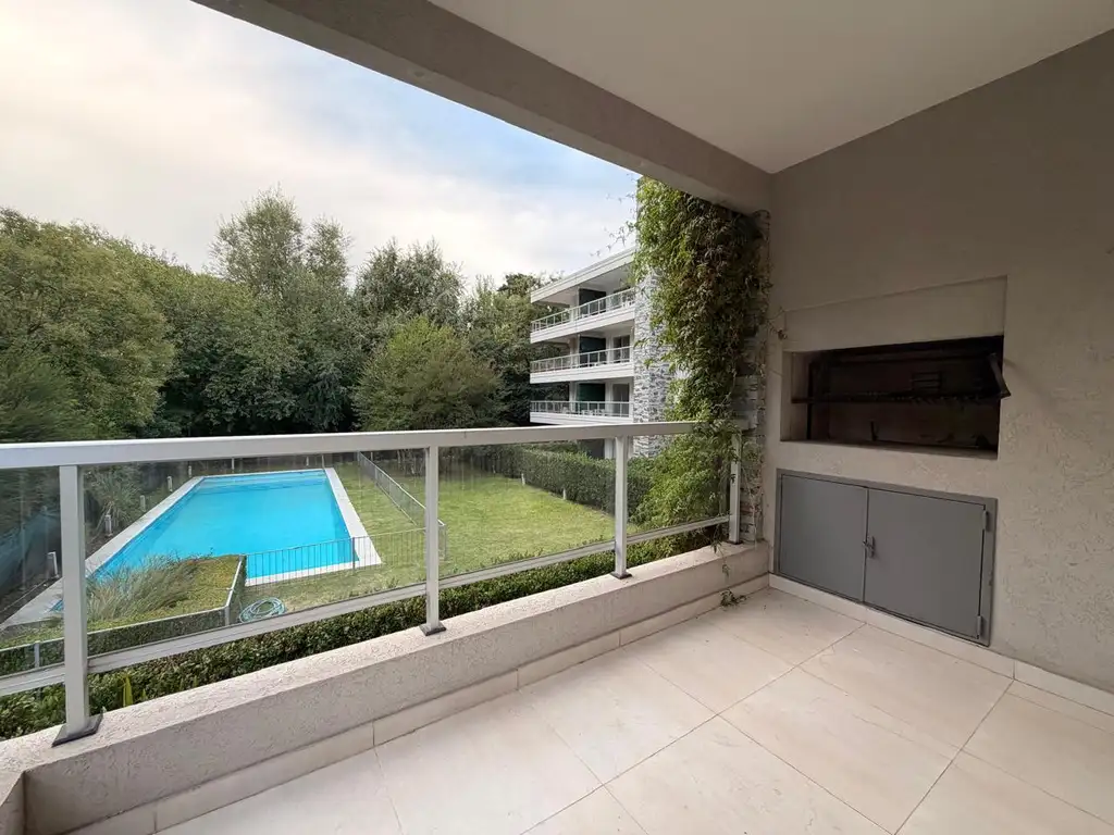 Living comedor muy luminoso con vista al parque central y a la pileta. Salida directa al balcón que tiene parrilla.