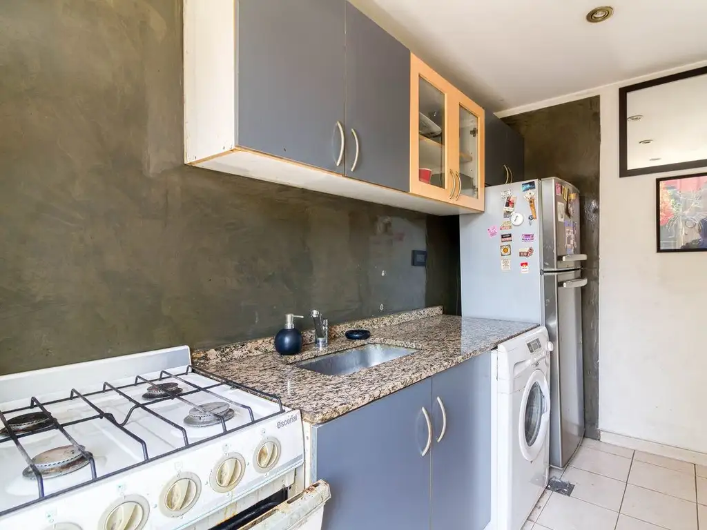 La cocina es independiente, con ventana al exterior, barra desayunadora, muebles bajo mesada y alacenas, artefacto de cocina a gas, conexión para lavarropas y buen espacio de guardado. El baño es completo, con bañadera, revestimientos cerámicos y vanitory moderno.