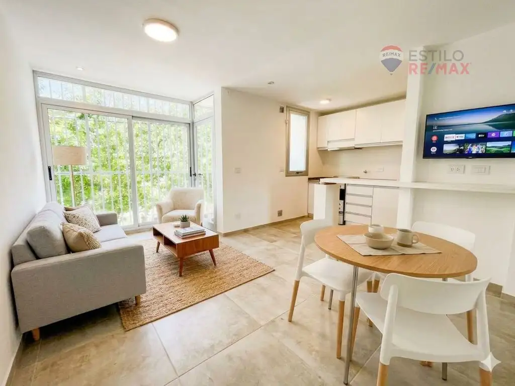 En el primer nivel cuenta con living comedor con la cocina integrada por una barra desayunadora, un dormitorio con placard c/interiores en melamina, baño completo y balcón corrido al frente. En el segundo nivel existe un quincho cubierto cerrado que tiene medidas de un monoambiente, con baño completo, kitchinette, y balcón al frente, también un sector descubierto que funciona como solarium.