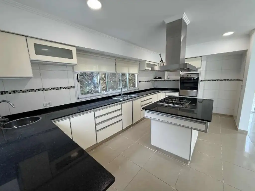 -Moderna cocina con gran isla central y amplio espacio de guardado, integrada a un luminoso living comedor con ventanales que conectan con el jardín.