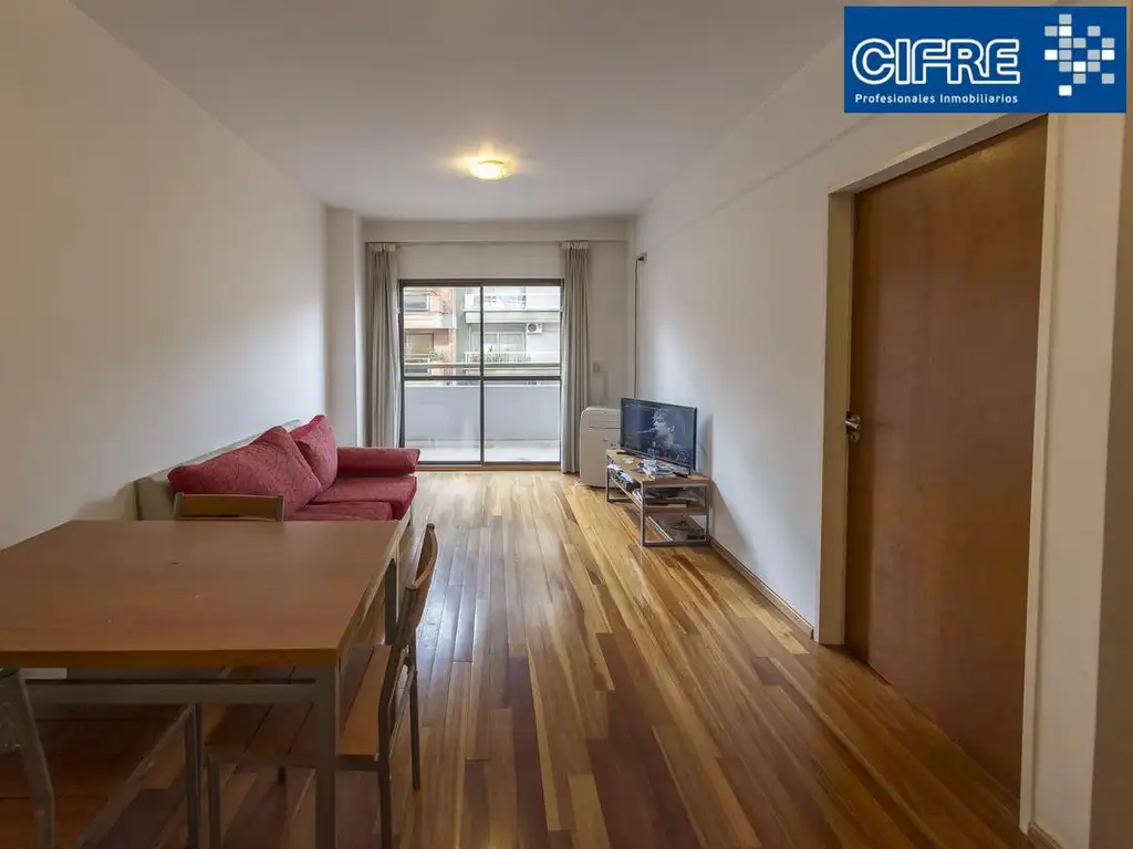 Living con salida a balcón. Cocina integrada con barra desayunadora. Pisos entablonados de madera. Baño completo. Lavadero en balcón. Agua caliente por calefón. Dormitorio con amplio placard. Portero visor.