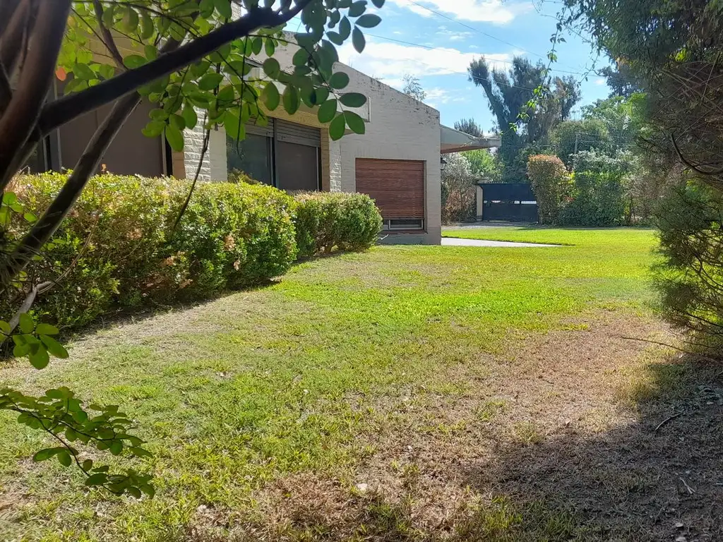 la casa en una planta, tiene 4 dormitorios, dos baños cocina con comedor diario, living grande con ventanales al jardín. baño y dormitorio de servicio lavadero.