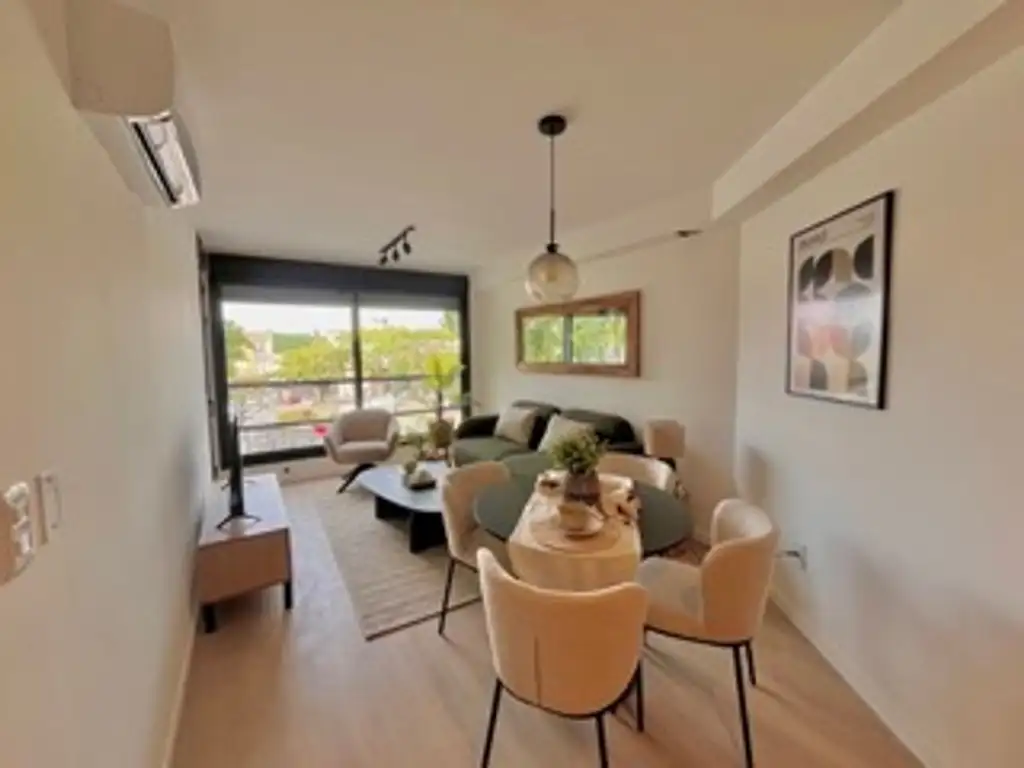 Al ingresar, se accede a un amplio espacio de living-comedor con cocina integrada y salida a la terraza. La cocina cuenta con muebles aéreos y bajo mesada de alta calidad, campana extractora y aire acondicionado ya instalado en el living, completando el sector social.