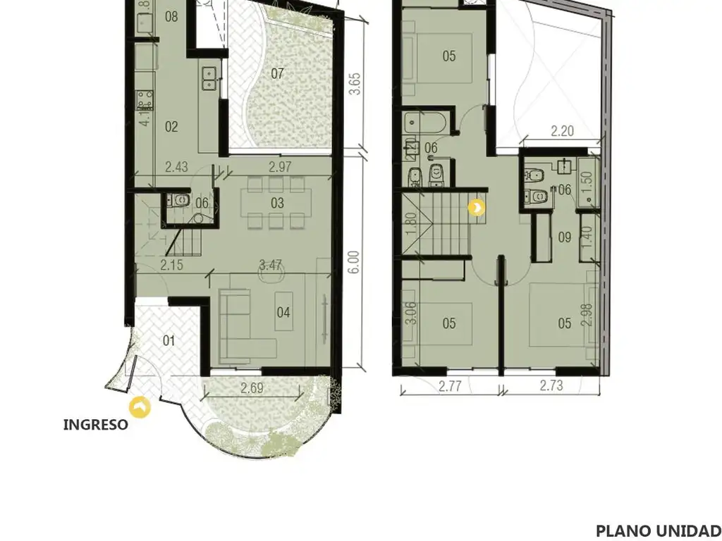 Viviendas tipo casa con ingreso independiente, estar-comedor, cocina, dormitorios según configuración y baños completos. Patio exclusivo al contra frente y al ingreso. Sector intimo en planta alta compuesto por 3 dormitorios. Suite principal con vestidor.