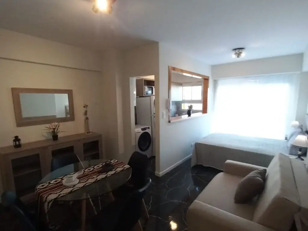La propiedad se destaca por su balcón saliente a la calle, su muy buena luminosidad y una distribución cómoda y funcional. El ambiente principal ofrece espacio para sector de descanso y living-comedor, con pisos cerámicos, placard y mobiliario completo.