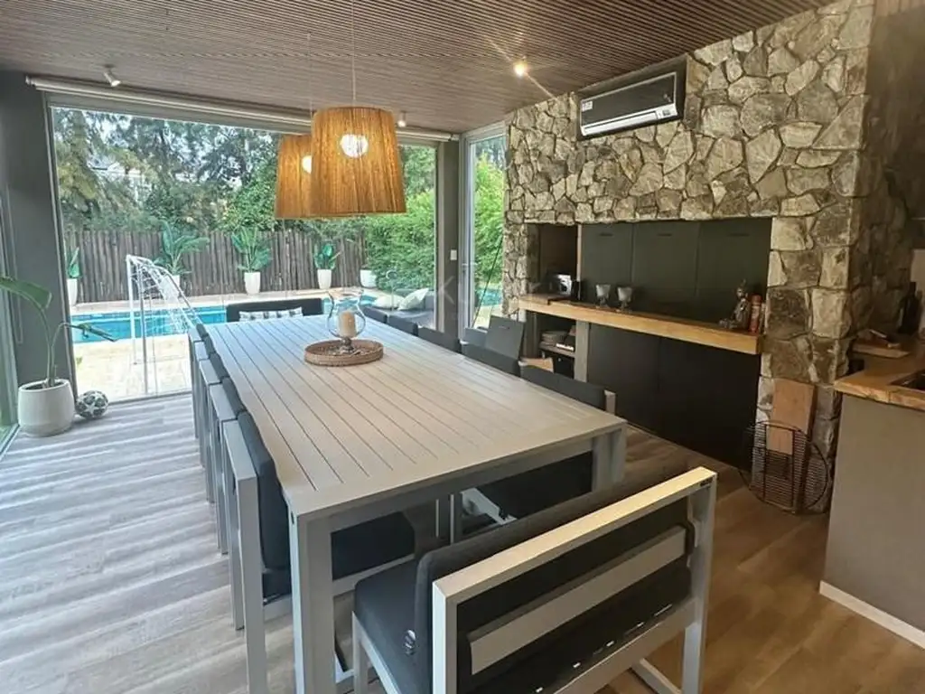 Exterior: Jardín parquizado con riego e iluminación. Pileta climatizada totalmente revestida con venecitas. Sector de fogonero. Doble galeria: una con sector de living exterior y la del sector parrilla con cerramiento vidriado Reiki, losa radiante, aire acondicionado frio-calor, gran parrilla parrilla a leña, parrigas y mesada con bacha.