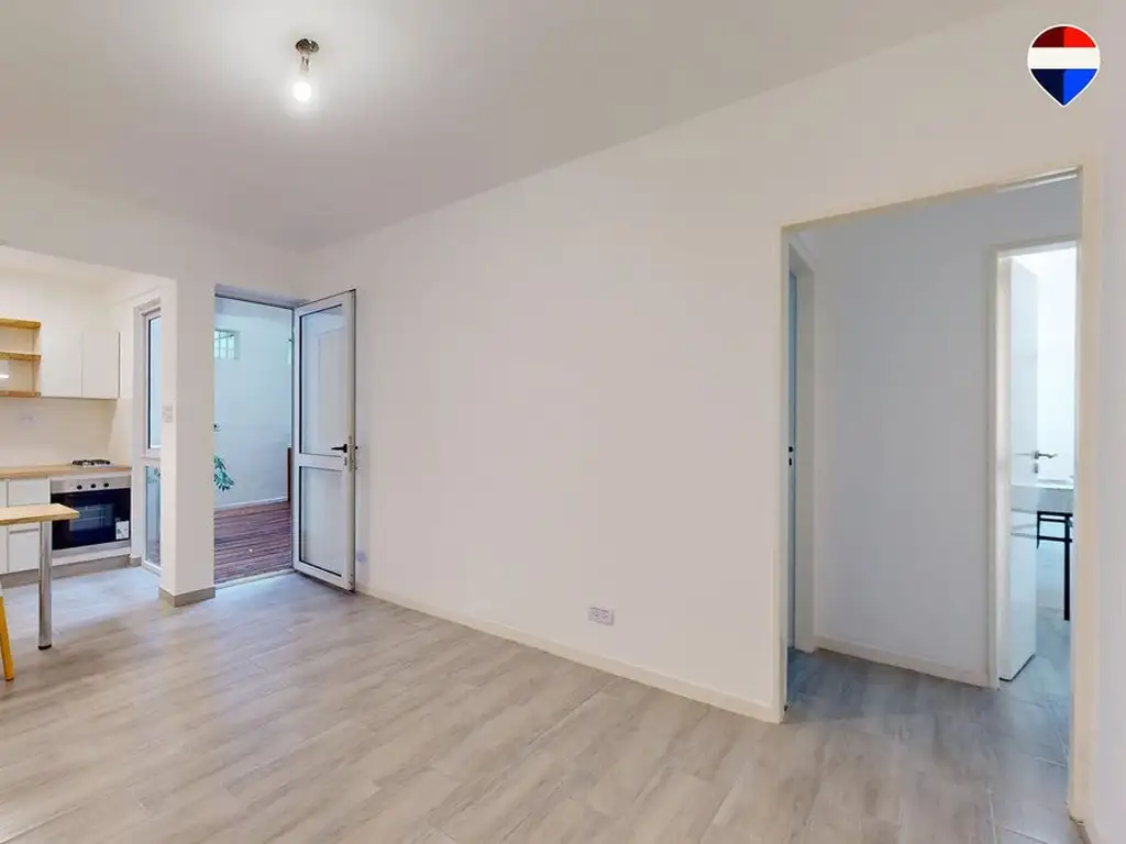 La propiedad presenta una distribución optimizada con dos ambientes principales silenciosos y con gran diseño: living comedor amplio y dormitorio con placard de gran capacidad. Cocina integrada con ventanal que conecta al patio exterior, generando luminosidad y amplitud. Baño completamente renovado con terminaciones modernas y de primera calidad.