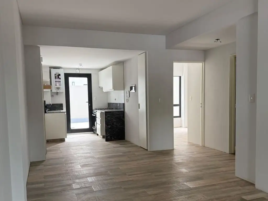 La propiedad cuenta con dos dormitorios: uno con salida directa al balcón y otro orientado al patio del departamento. Cocina integrada completamente equipada con mesada de mármol, muebles completos, cocina y anafes a gas; salida al patio. Baño completo con mampara y espejo instalado.