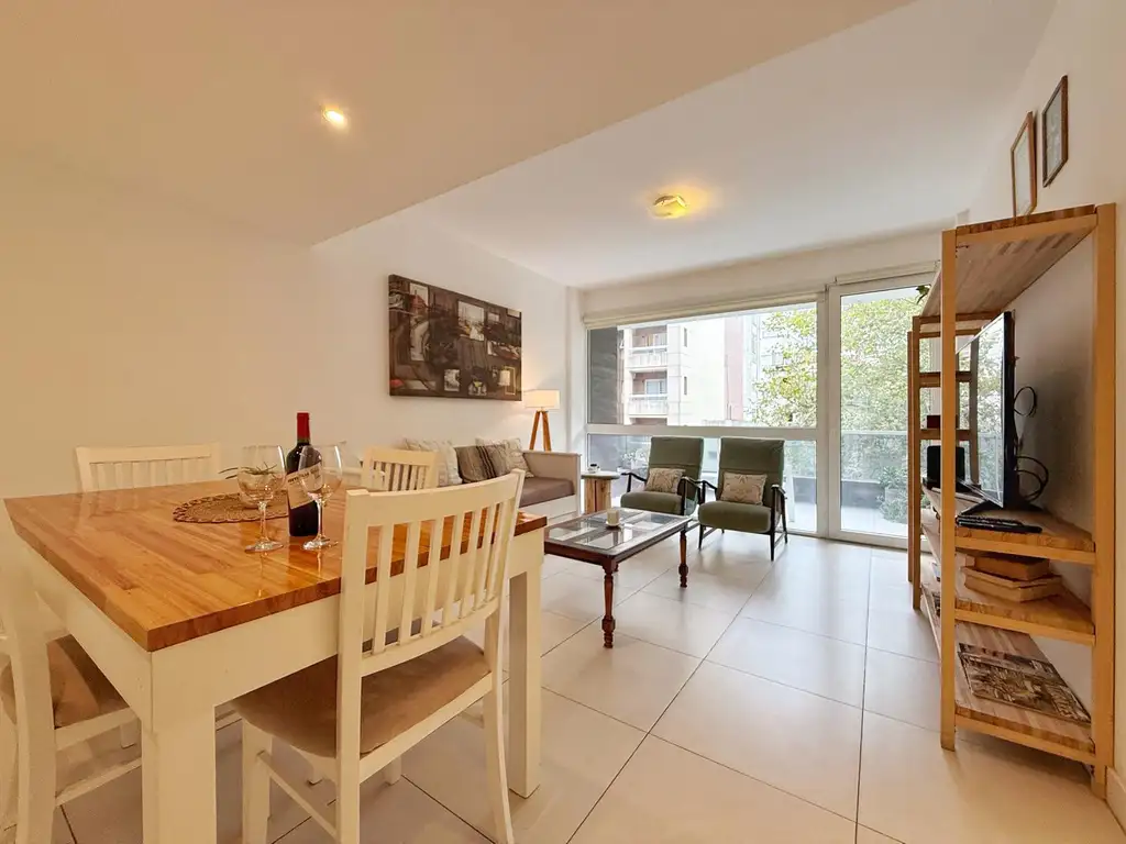 Amplio living comedor con balcón aterrazado al frente, cocina integrada con barra y espacio para lavarropas, baño completo con bañera y dormitorio con placard y balcón al contrafrente.