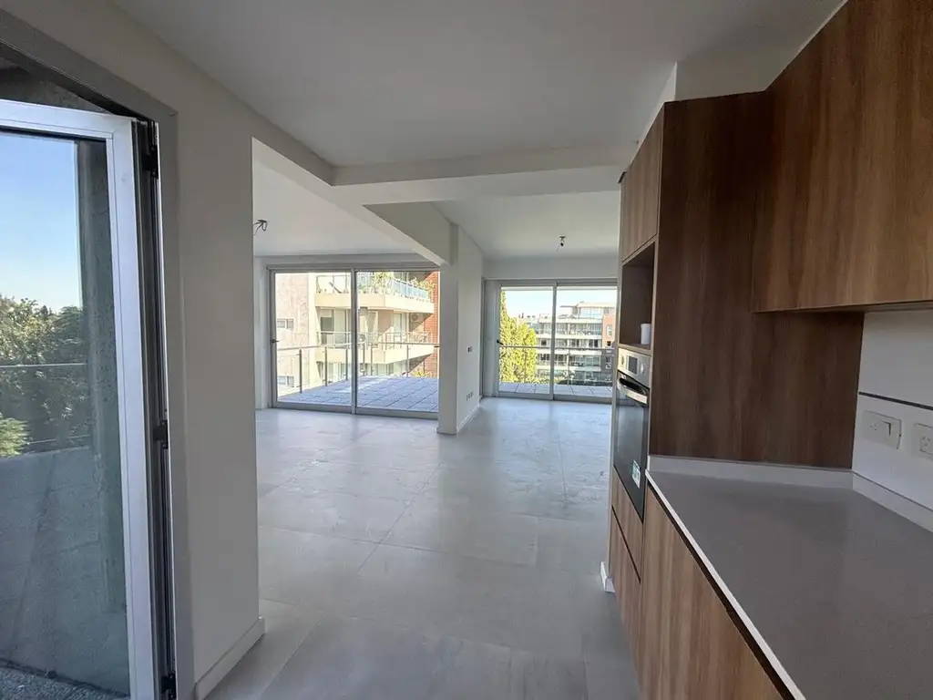 Al ingresar encontramos un amplio living comedor , cocina integrada con alacenas y bajo mesadas y espacio para lavarropas y lavavajillas, un ambiente moderno y funcional que se conecta con un balcón aterrazado con vista abierta, aportando luz natural y ventilación.