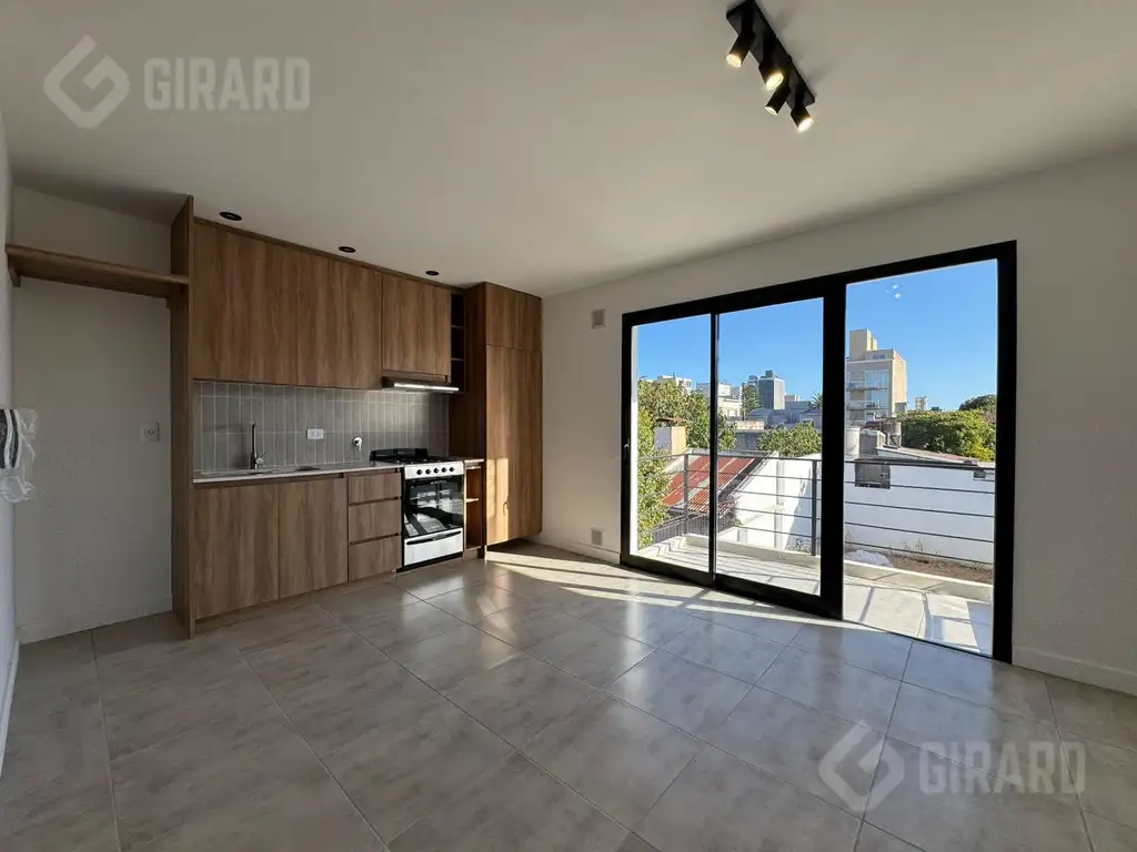 Living comedor . Cocina integrada, baño completo con ducha, habitación a la calle con Placard .