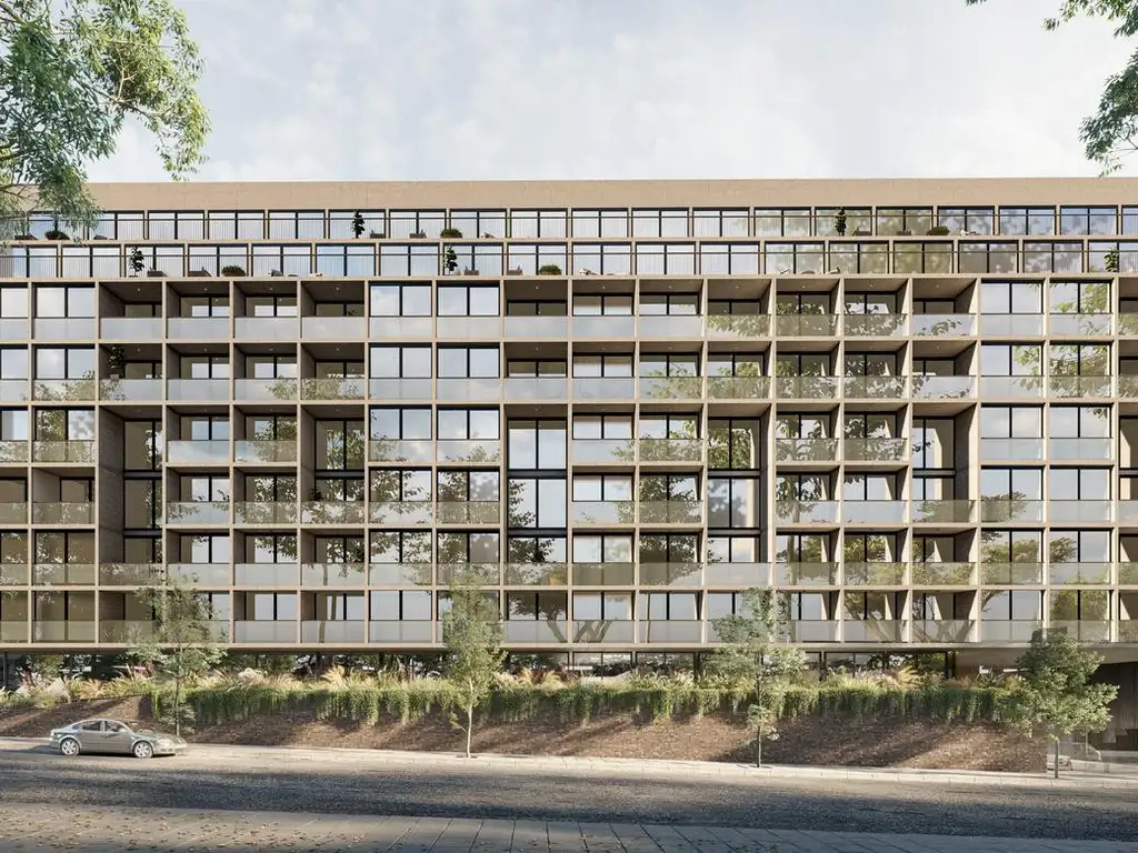 8 pisos, fachada moderna con diseño ecológico y detalles constructivos premium.