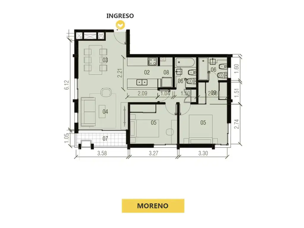 Departamentos 2 dormitorios con estar-comedor de generosas dimensiones, cocina independiente o integrada, baños completos y expansiones exteriores. Suite principal con ventanal al frente. Habitación secundaria asistida por baño completo. Balcón al frente sobre calle Moreno.