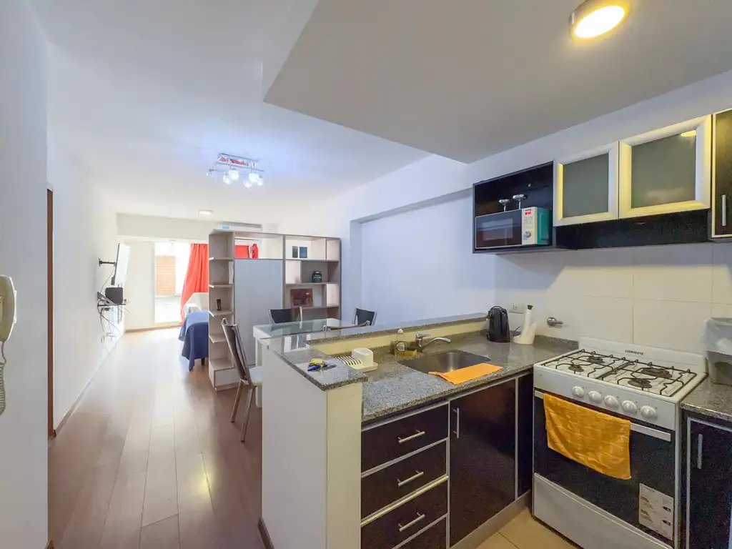 Características: ingreso a ambiente unico de grandes dimensiones, baño completo con bañera. Departamento que se alquila amoblado, cocina con muebles bajo mesada y alacenas semi integrada al ambiente separada por barra de mármol de granito. Mueble separador de comedor con habitacion. Salida al contrafrente a patio de muy grandes dimensiones de uso exclusivo para poder usarlo, decorarlo y equiparlo a gusto.