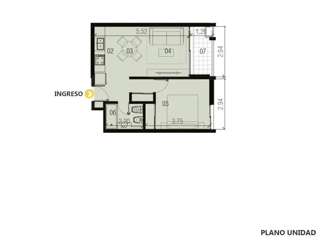 Ingreso a estar-comedor con salida a balcón y cocina integrada. Dormitorio con espacio de guardado. Baño completo.