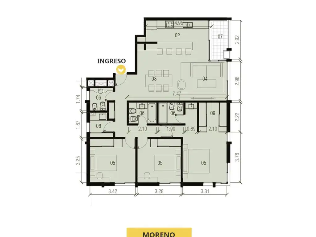 Departamentos 3 dormitorios con estar-comedor de generosas dimensiones, cocina integrada y balcón al Norte. Suite principal con vestidor y ventanal al frente sobre calle Moreno. Dos habitaciones secundarias al frente asistidas por baño completo. Toilette de recepción y lavadero.