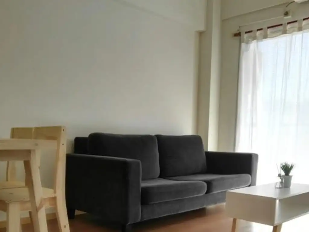 Dos ambientes amplio y luminosos en un octavo piso al contra frente. Al ingresar se encuentra la cocina integrada con el living comedor, este equiapado con mesa para cuatro comesales, mesa ratona mininalista, sofa de dos cuerpos, tv smart. El dormitorio cuenta con un gran vestidor y con cama doble o pueden ser dos simples, aire acondicionado.. Baño completo.