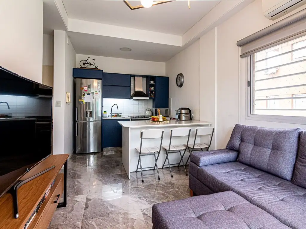 Departamento con terminaciones contemporáneas que integran funcionalidad y estética. Pisos de porcelanato símil mármol recorren los espacios, aportando elegancia y modernidad. Cocina renovada con mesada de silestone que potencia los espacios de preparación.