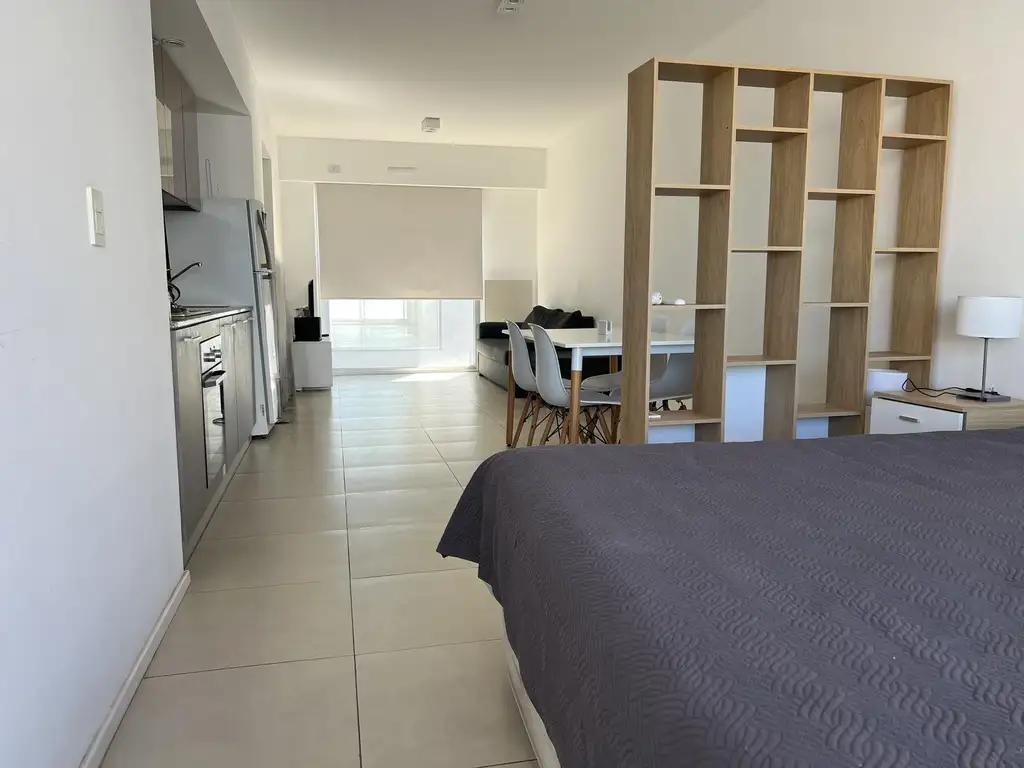 Ambiente principal con sectorización mediante mueble a medida, que divide el espacio y genera área de dormitorio independiente. Equipado con cama Queen.