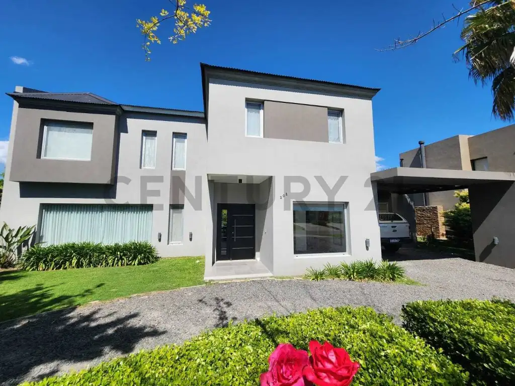 Casa 6 ambientes moderna y luminosa de 300m2 cubiertos y 60m2 semicubiertos. Se encuentra sobre un lote central de 1500m2, a sólo 100m del ingreso principal y piletas de natación, SUM y plazas. La casa cuenta con todos los servicios, está amueblada al detalle con primeras marcas de electrodomésticos y el barrio posee muchos amenities ideales para familias.