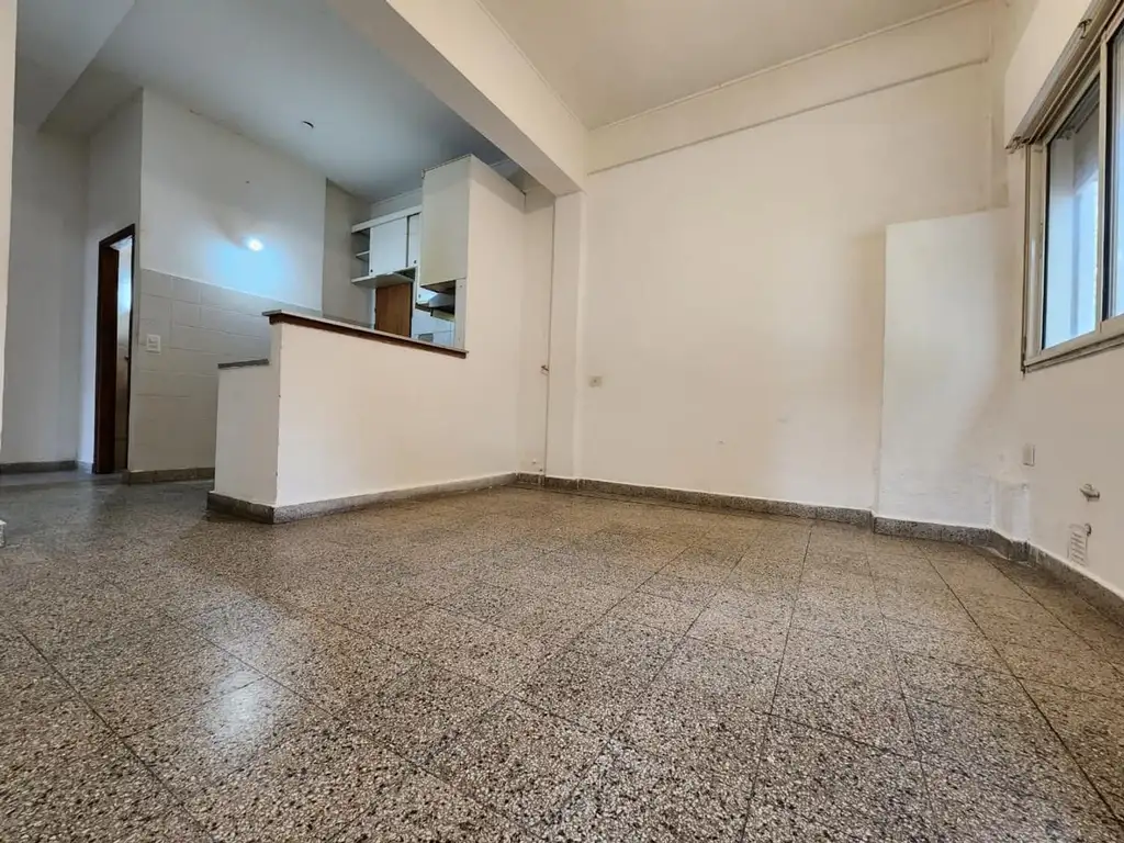 Living comedor con cocina semi separada, con muebles bajo mesada antiguos, en estado regular.