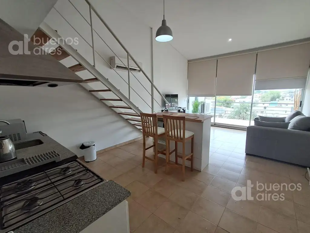En la planta baja se encuentra un amplio ambiente de living-comedor con sofá, juego de barra y sillas, TV y aire acondicionado frío/calor. Cortinas black-out. Salida a amplio balcón con hermosa vista.